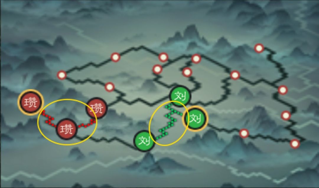(图一:黄色圈内绿色点线为我方补给线,红色点线为敌方补给线)