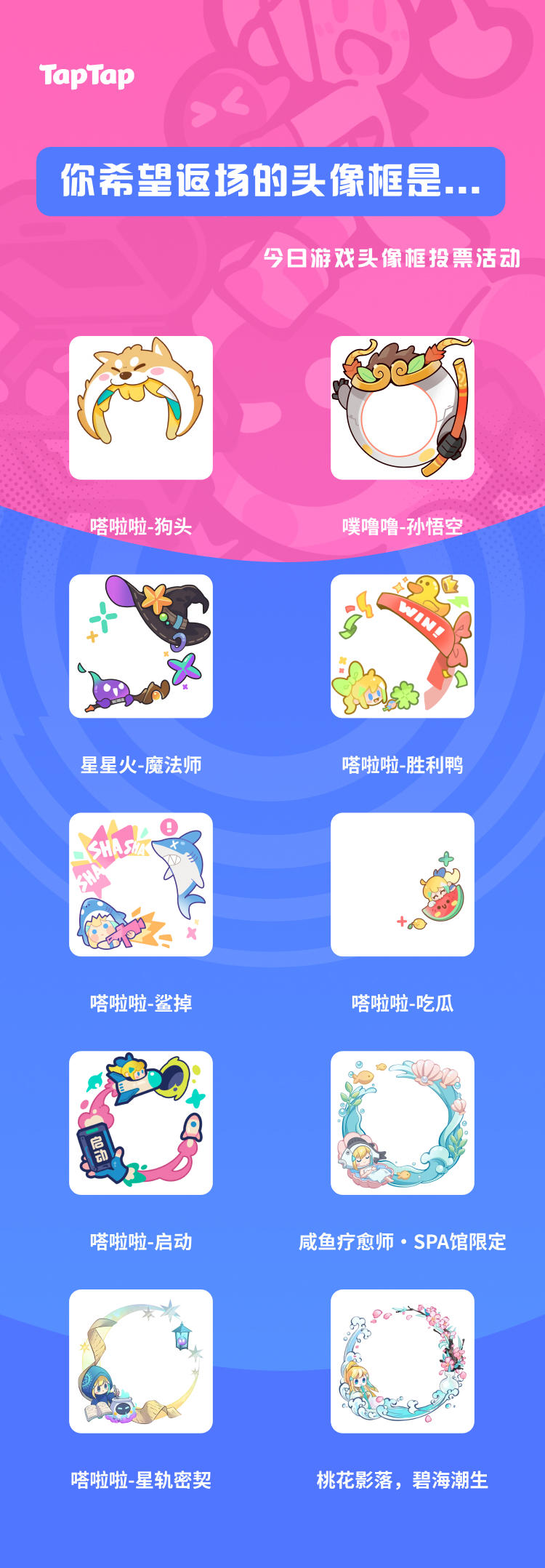 取今日游戏打卡签到活动正式上线后的前 10 个限定头像框作为候选,大家可以从中 pick 自己最心仪的两款!