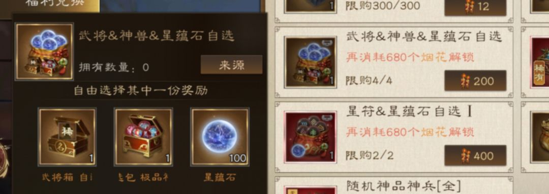 9.武将神兽蓝抽:200烟花,可以在以下3个中选择!肯定选3星神兽,但是有800门槛,比较难,中氪可以换