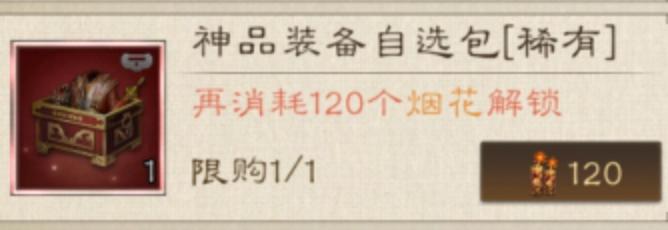 5.稀有神品装备自选:120烟花,限购1次,必换