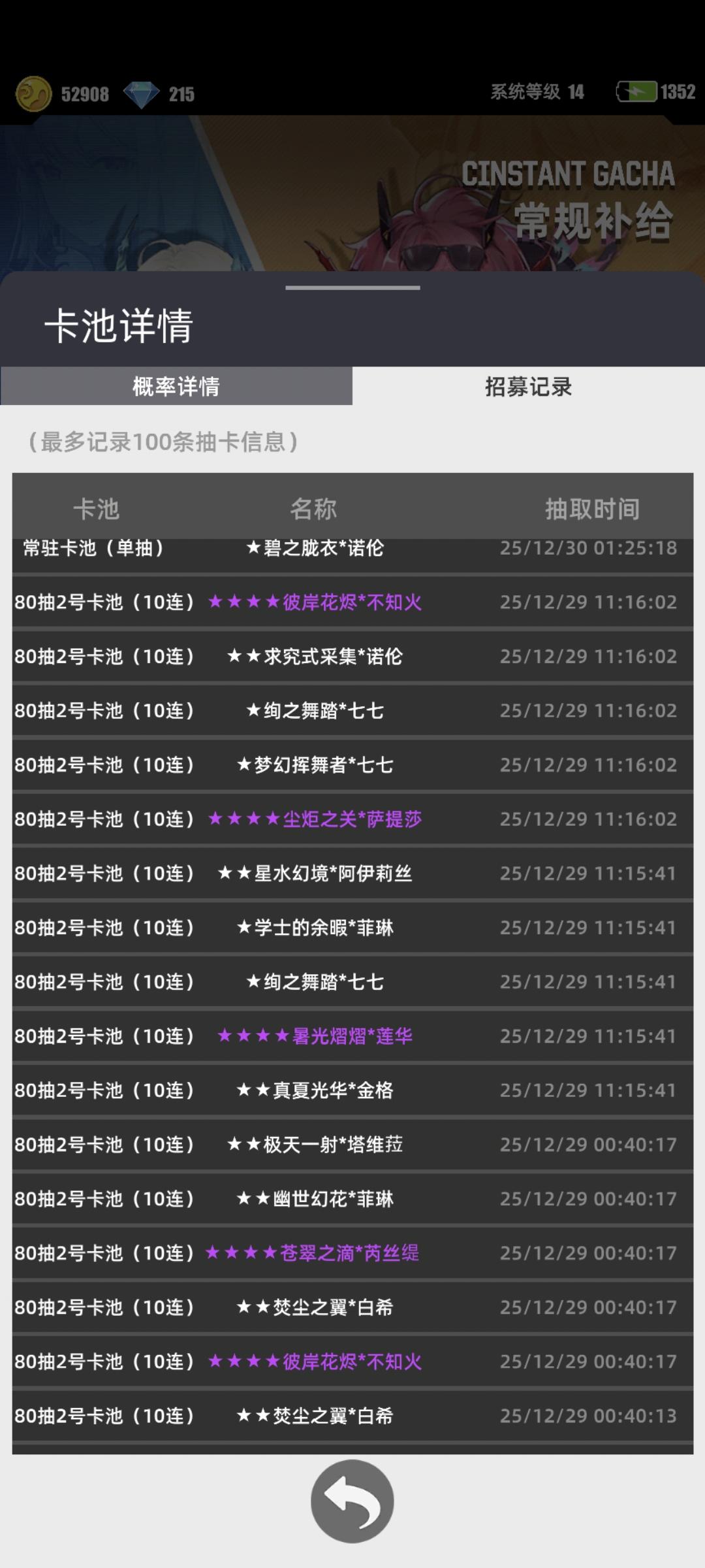 所以涉及到抽卡类游戏的话,那就要说一说他的卡池抽奖率。我之前玩过很多的卡牌的游戏,我的手是比较黑的。一般都是保底出。但是这款游戏它的抽奖率明显挺高的。我甚至有一发10连中了四个。