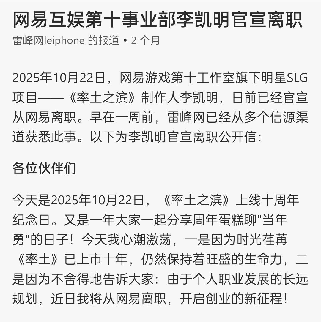 10月爆发包括《阴阳师》事业部负责人金韬(“阴阳师之父”)、《世界之外》制作人璇子、互娱第十事业部负责人李凯明(《率土之滨》《无尽的拉格朗日》元老)在内的多名关键制作人和高管离职。