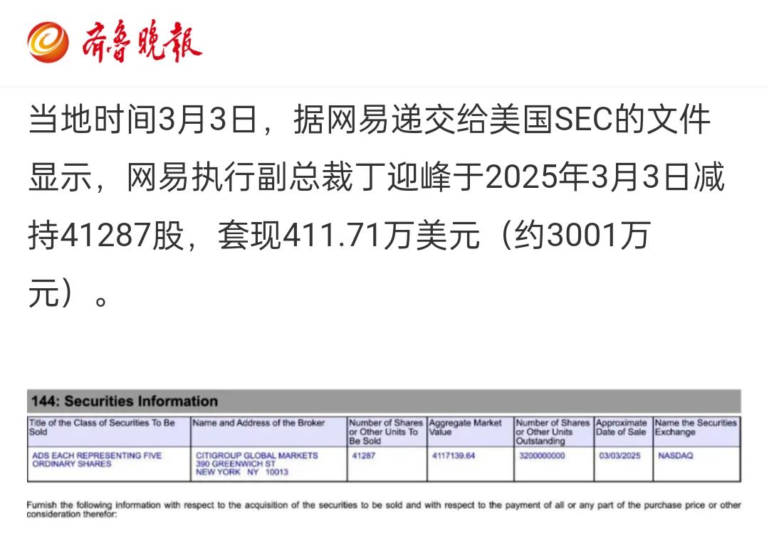 2025年3月3日,网易在提交给美国证券交易委员会(SEC)的文件中披露,丁迎峰减持了41287股网易股票,套现约411.71万美元(按当时汇率折合人民币约3001万元),引发市场关注。