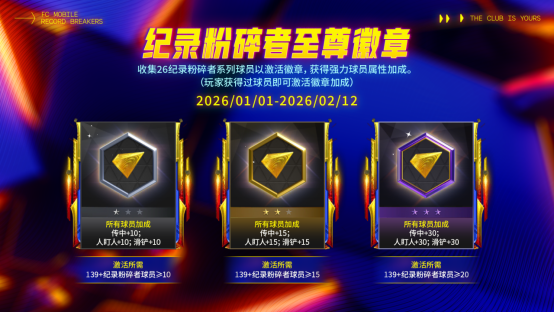 玩家需收集能力值139及以上的纪录粉碎者球员(获得过即为点亮),达到徽章激活所需的数量即可解锁新徽章,而后可以继续收集球员解锁更高星级的加成。配备纪录粉碎者至尊徽章后,会提升全体球员的传中、人盯人、滑铲三项数据。