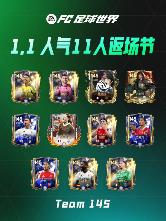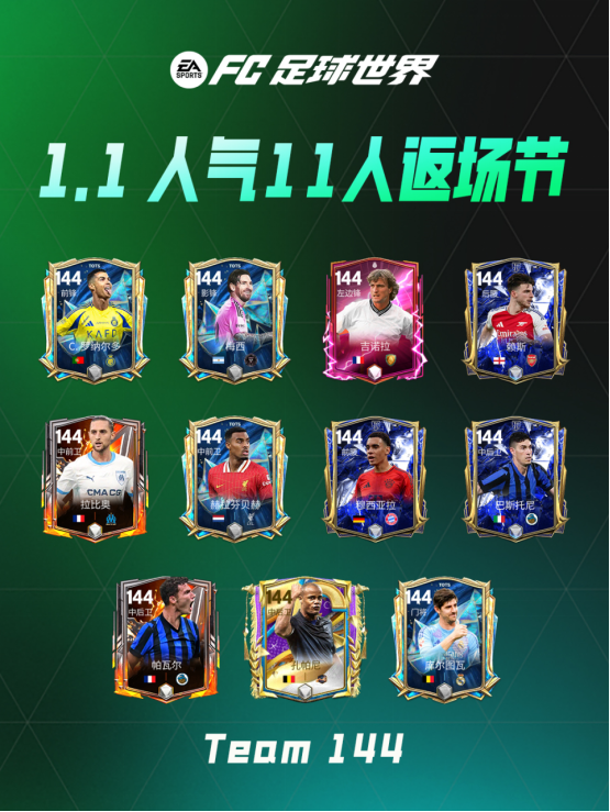 141年度最佳25传奇收藏礼包在本周更新后也将开启,每次购买,都可以获得一名141 能力值年度最佳25传奇球员,并且有额外概率获得 143-147人气十一人球员。