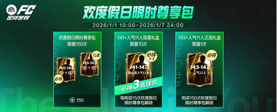欢度假日限时尊享包也将在本周四更新后进入商城。购买欢度假日限时尊享包,必得1名140+混合球员,并且有概率获得145+混合球员,礼包单价为150点券,最多购买150次。