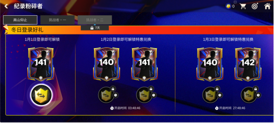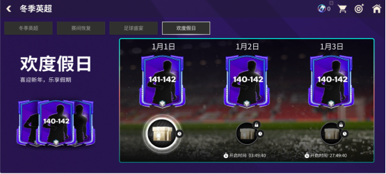 1月1日、1月2日、1月3日,玩家登录游戏,即可前往冬季英超-欢度假日章节中领取登录奖励,包含三张冬季英超球员卡奖励。