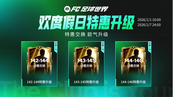欢度假日特惠升级交换开启,特惠参与142、143、144欢度假日特惠升级交换,有几率获得更高能力值球员卡奖励,每项卡池玩家仅限参与一次。