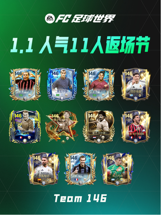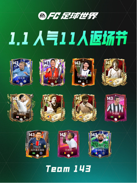 经过玩家投票选出的143-147能力值人气11人阵容返场即将来袭。玩家可以通过对应能力值的人气11人交换卡池,交换获得对应能力值球员卡。每项能力值卡池可参与2次。