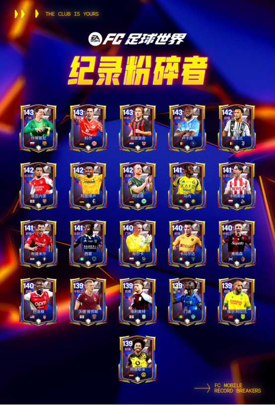 本组球员基础能力值为能力值139-148,共计41人。148能力值球员有穆勒、哈维、萨内蒂、巴雷西四位,所有纪录粉碎者球员,玩家可以通过球员对应能力值的交换卡池获取。