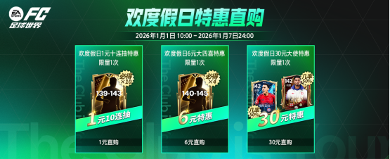 欢度假日30元大使特惠,30元直购必得142赛季最佳穆西亚拉或142蛇年新春贺岁贝林厄姆,两位大使球员中的一位,限量1次。