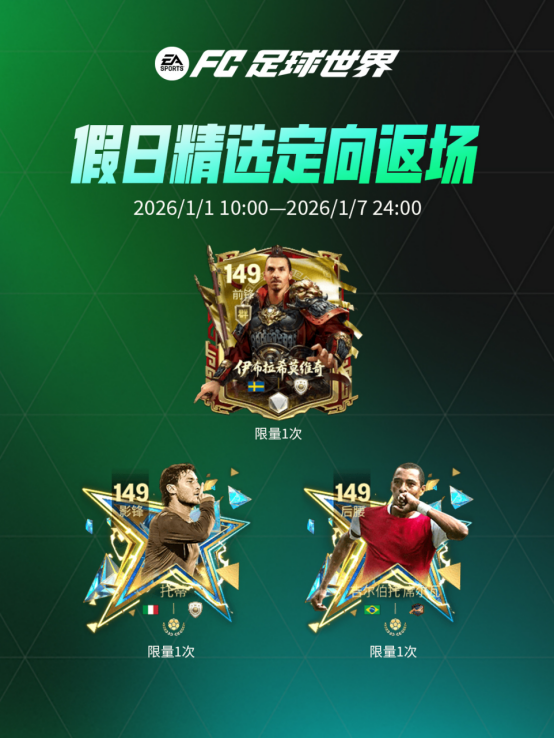 1月1日10:00-1月7日24:00,149假日精选定向返场,玩家可以参与149三国·群雄逐鹿伊布拉希莫维奇、149团队领袖托蒂、149创始周年庆吉尔贝托席尔瓦三位149球员的定向交换。