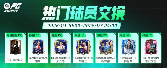 本周更新后,球员交换部分我们将迎来139+球员x5混合交换,以及142年度最佳24赖斯、143年度最佳24孙兴慜、144年度最佳24萨利巴、145年度最佳24哈兰德、146宿命对决萨内蒂、147英雄登场亚亚图雷,六项定向交换在内的,共计七项交换项目。