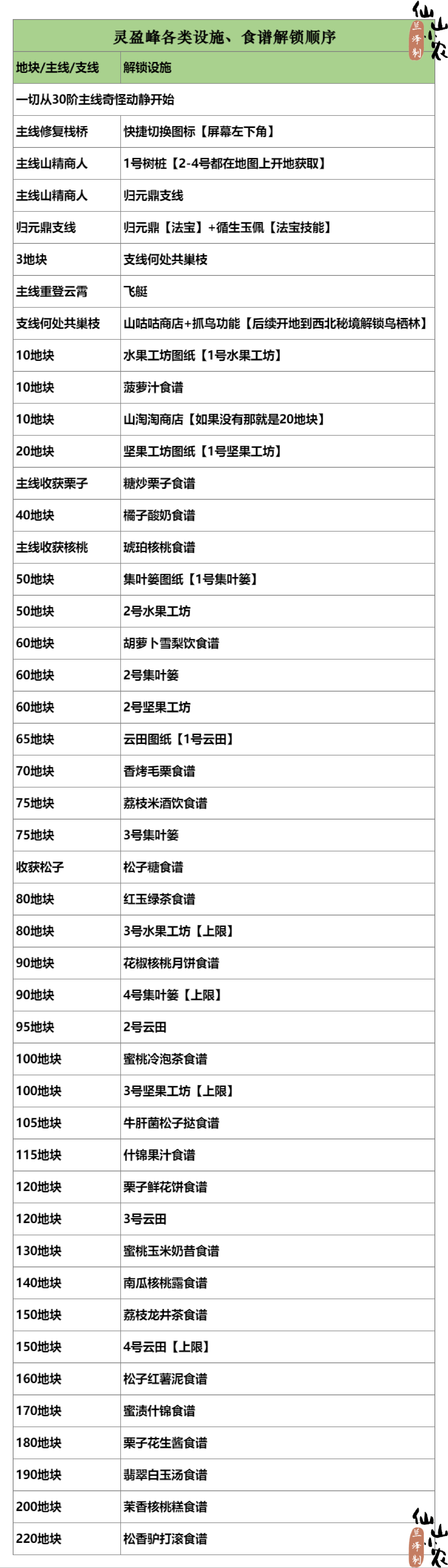 图3是整理的灵盈峰各功能、设施、菜谱的解锁顺序