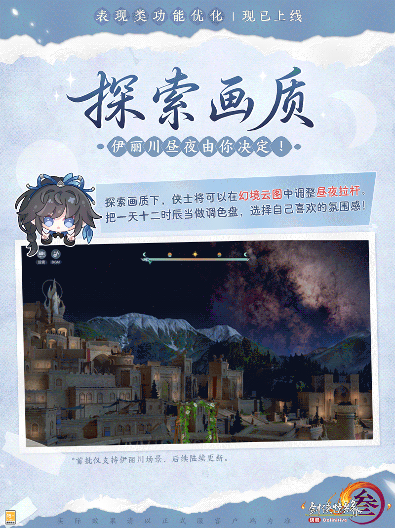 万事俱备,即刻奔赴伊丽川,让自然天光成为最动人的滤镜!无需卡点等候刹那风采,在探索画质的幻境云图加持下,侠士可随心调控伊丽川的昼夜更迭,十二时辰,万千风貌,每一时刻皆有其专属韵味!