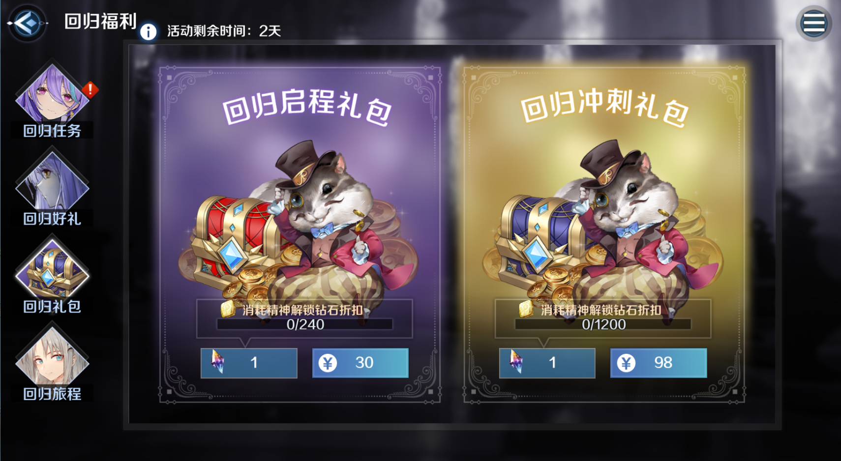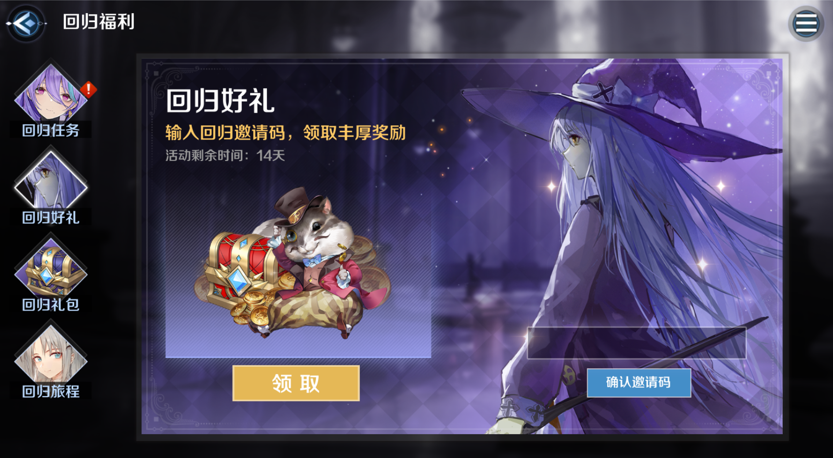 ② 回归好礼:通过输入回归邀请码,领取丰富奖励。