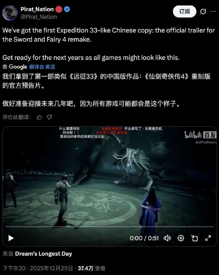 北京时间2025年12月29日11时,UP software研发、方块游戏发行的《仙剑奇侠传4重制版》公开首支实机预告片,其战斗系统被部分海外玩家指与《光与影:33号远征队》存在相似性,进而被冠以“类33号远征队游戏”的标签,相关讨论在全球游戏社区引发争议。