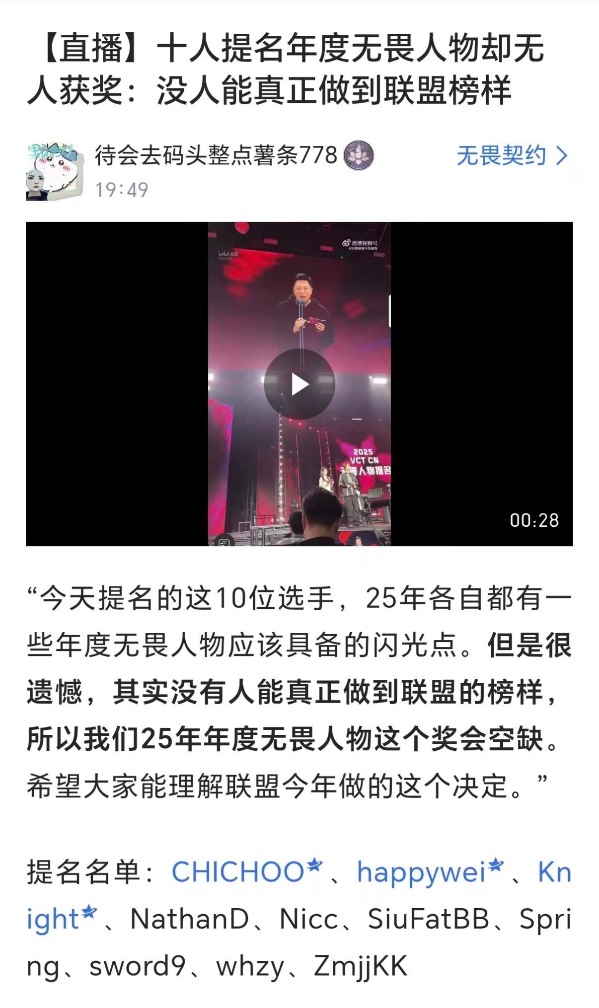 2025年,无畏契约电竞联盟宣布年度无畏人物奖空缺,因十位提名选手虽各有闪光点,但均未同时满足“场内稳定竞技表现”与“场外榜样形象”的奖项核心标准。
