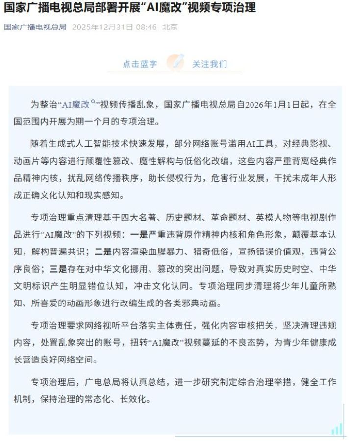 国家广播电视总局明确整治AI魔改视频传播乱象,自2026年1月1日起,在全国范围内开展为期一个月的专项治理行动,精准打击违规乱象。