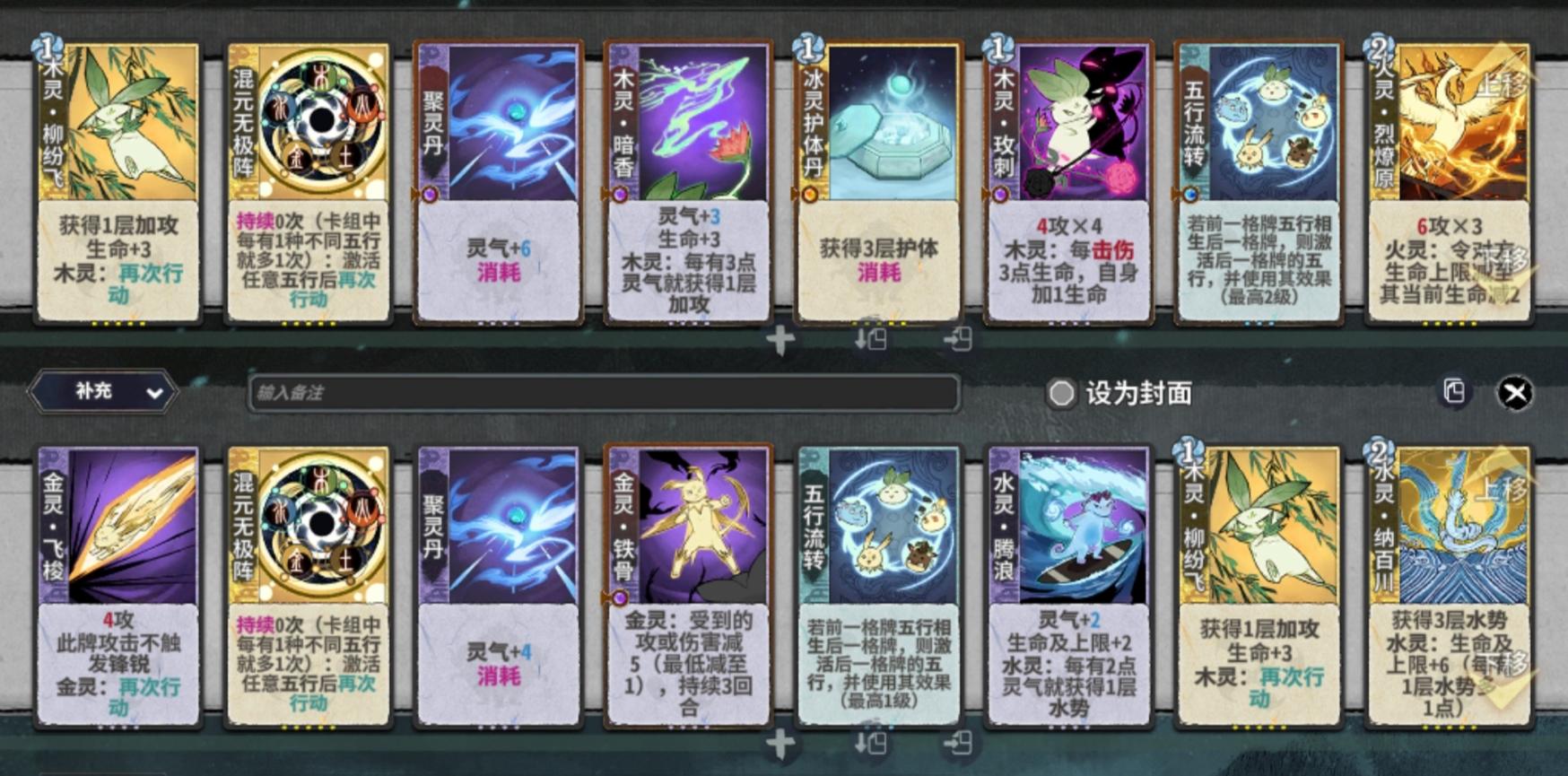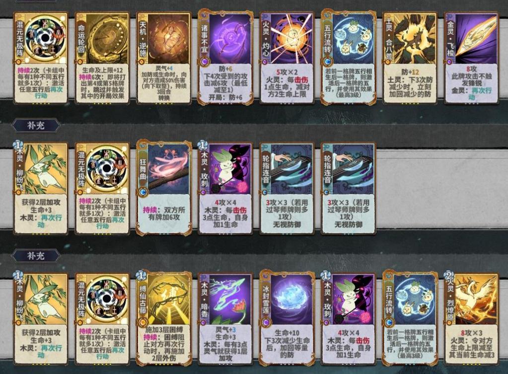 化神玩大混元有两套成型卡组,一个木火土,一个金水。木火土也可以一动流转合八荒。金水主要靠铁骨打云剑百杀木火。打琴师建议多留几张腾浪玩水。没有大混元可以玩天髓水、木火多段。