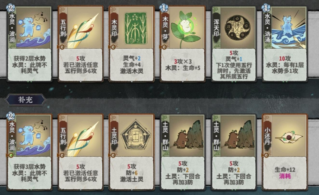 金丹,微d或不d,优先d掉副职卡:关键卡是泉涌、断崖、巡林、扬尘、疗伤丹、五行流转。