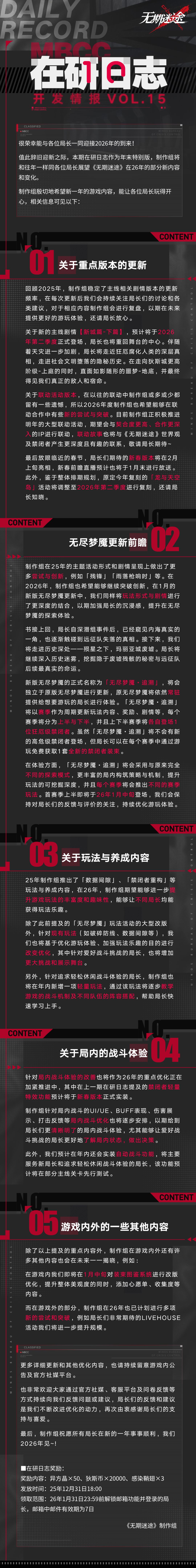 制作组的最新一期【在研日志】&【行动回顾】现已送达,本期作为年末特别版,制作组将同各位局长一起回顾《无期迷途》25年的难忘回忆,并展望26年的部分新内容和变化。