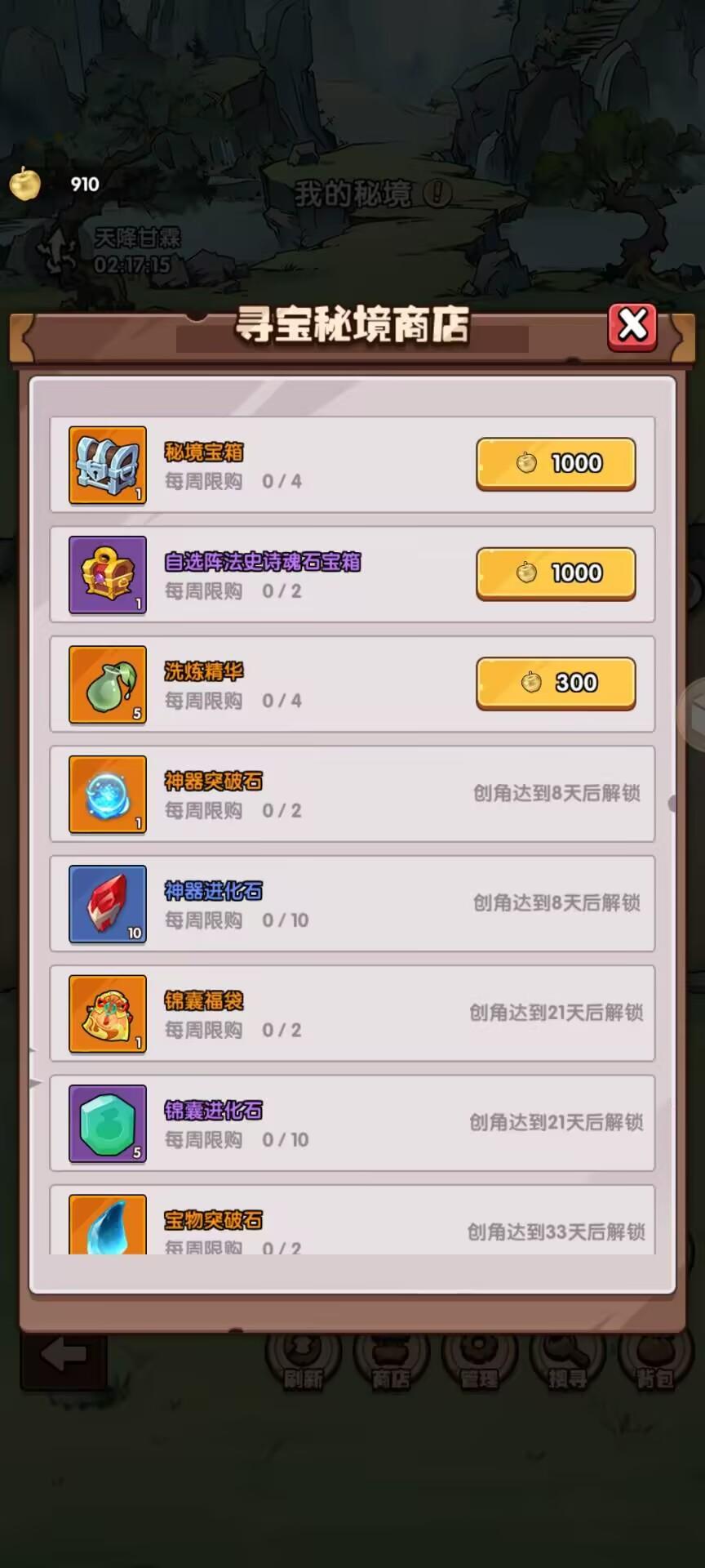 第六天开寻宝秘境:这个是本游戏最耗时间的,也是0氪,微氪与小氪玩家最需要肝的,有永久卡可以减少2分钟刷新时间,可以提升寻宝效率。每个区情况不一样,优先拉苹果,其次是原石。雇佣矿工越多效率越高,原石消耗依次是50,300,600,900。。。后面每个矿工增加300原石消耗,初始为1个矿工,体力为21点,每多1个矿工会增加1点体力,前面一半体力消耗的时间短,后面一半体力消耗的时间长。