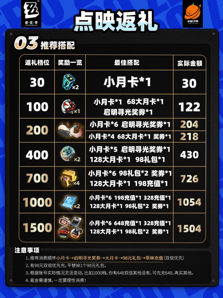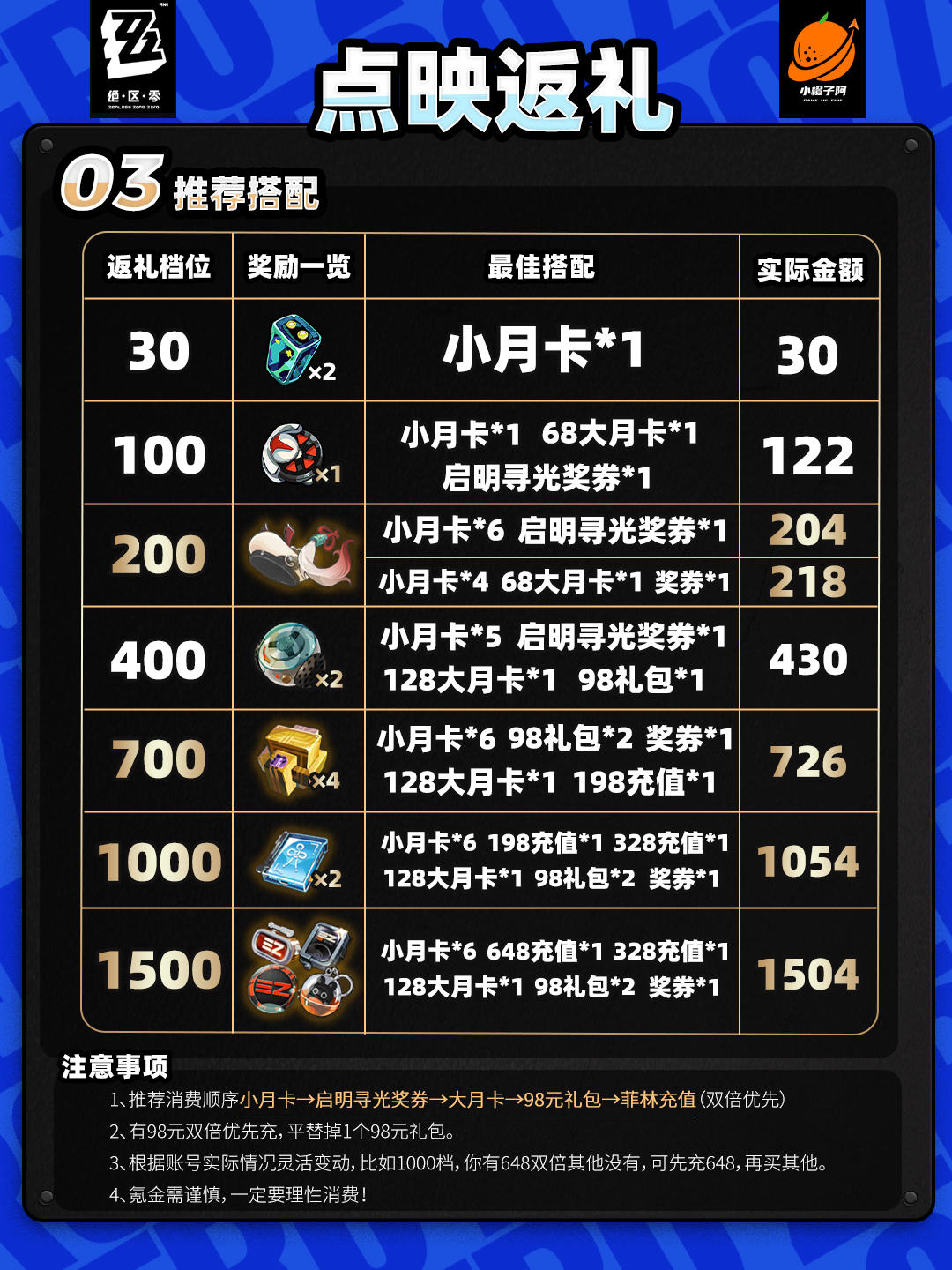 小伙伴们可根据自己钱包情况选择累充档位,橙子在每个档位推荐一种不错的累充方式,小伙伴可根据图示进行累充。