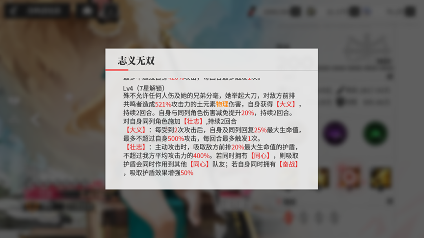 ②对自身同列角色施加获得【壮志】:主动攻击时,吸取敌方前排20%最大生命值的护盾,不超过我方攻击 400%,持续2回合。若目标同时拥有【同心】,将吸取护盾同时转移至【同心】队友身上;若目标同时拥有【奋战】,吸取护盾效果增强50%(即为吸取30%最大生命值)。