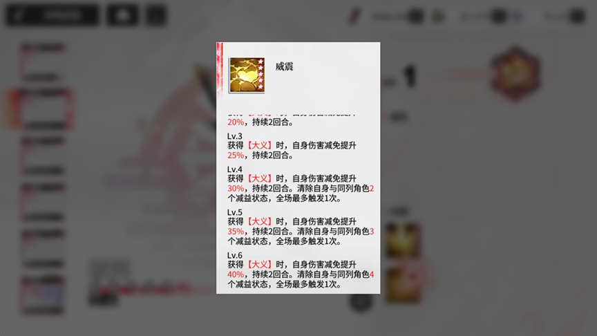 8阶专武威震在自身获得临界技【大义】状态时给自身以高额40%伤害减免以及清除联动双单位4个减益状态的能力,提升反打能力适配高压战斗环境。
