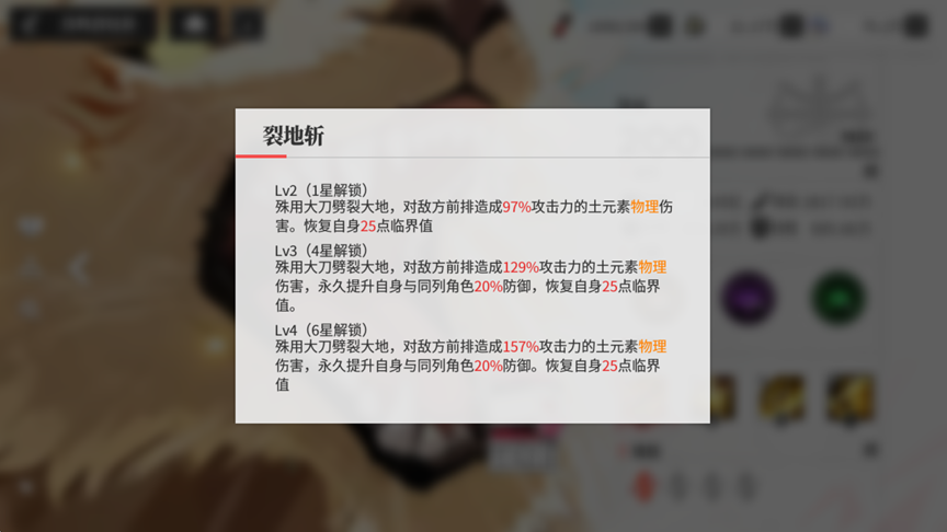 2.普通攻击:裂地斩永久提升自身与同列角色 20% 防御(最多叠加 2 层),提升同列被保护单位容错。