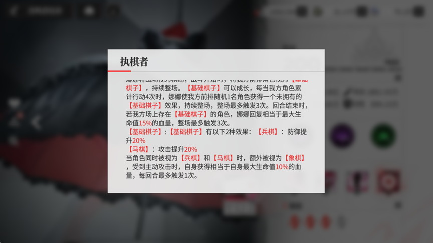 ②娜娜(MR 赋能型辅助)的【基础棋子】赋能(攻击提升 20%)+【后棋】伤害加成,能协同殊的单列生存提升手段,为输出核心提升攻击的同时获得高额抗伤能力,同时娜娜还能对前排的受到伤害减少和增加抗暴增益同时回复血量。