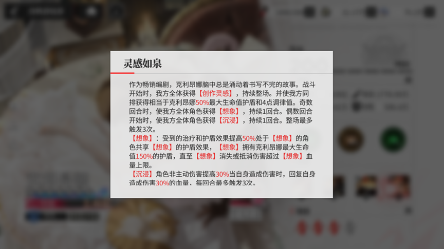 ③克利昂娜(UR 防御核心)的【创作灵感】(开局 60% 伤害减免)覆盖全队前中期承伤,奇数回合的【想象】(治疗/护盾效果 + 50%)联动殊的护盾收益,让殊的技能更为有效。