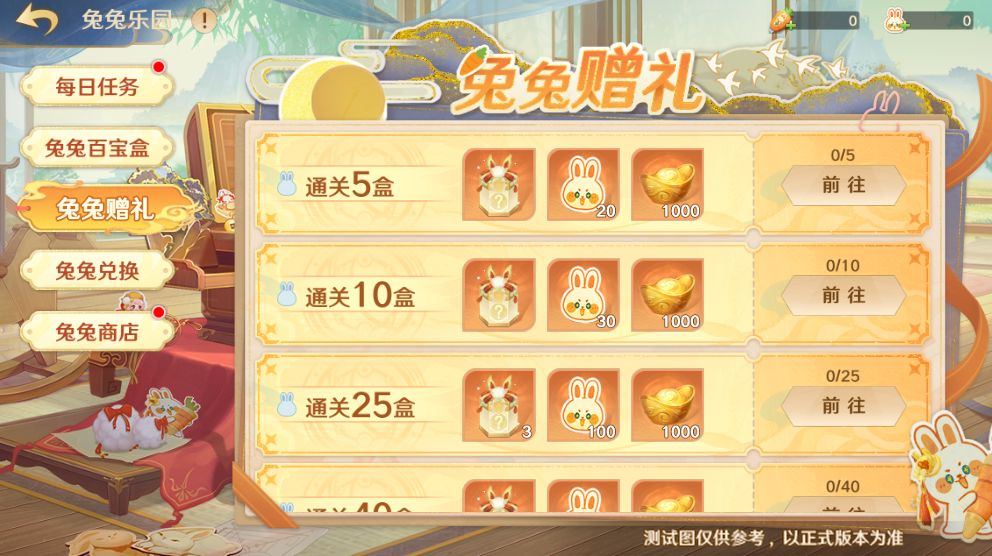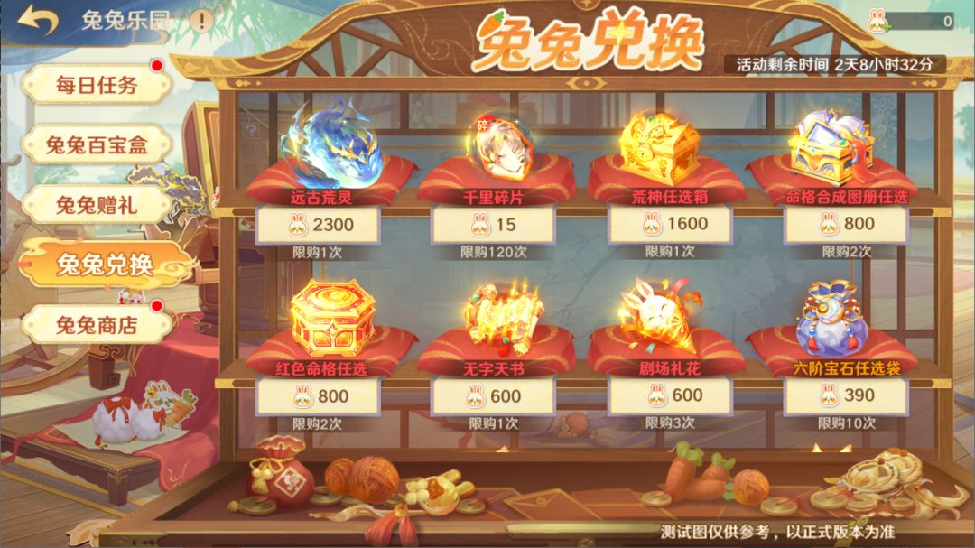 兔兔乐园包括:【每日任务】、【兔兔百宝盒】、【兔兔赠礼】、【兔兔兑换】和【兔兔商店】
