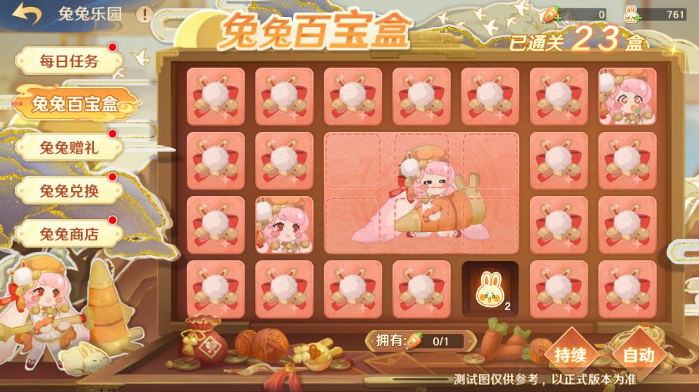 守护使大人进入【兔兔百宝盒】后可以使用兔兔萝卜刀开启宝物格子,格子的奖励包括元宝、高级精炼石以及兔兔积分。其中兔兔积分可以在【兔兔兑换】中用于兑换各种丰富道具。当守护使大人选中玩偶所在的传送门时,就可以获得当前盒子所有的奖励并传送至下一个百宝盒!