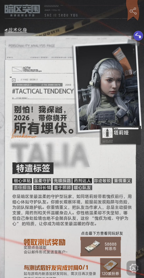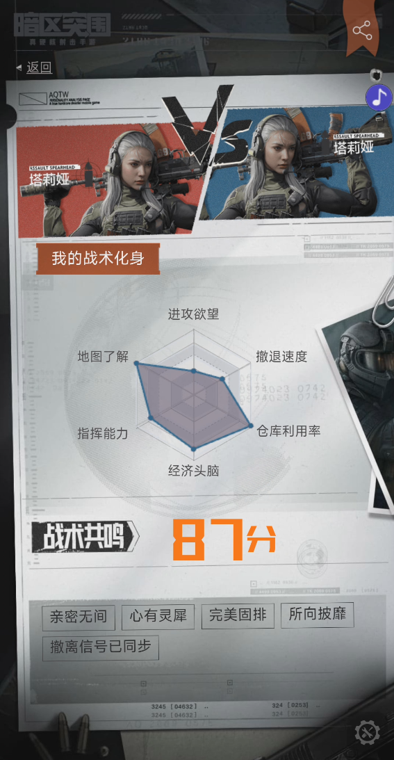 老皮的测试出来塔莉娅是我的战术化身!不知道各位先锋和谁更匹配呢?欢迎在评论区分享!