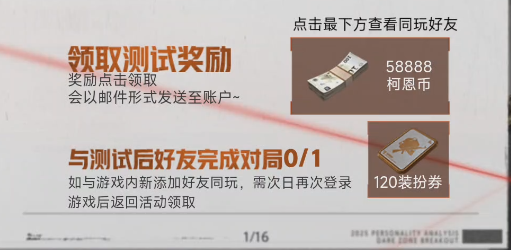 完成测试并与同样已参加测试的好友同玩,在该页面点击【柯恩币】、【装扮券】图标,即可获取58888柯恩币+120装扮券奖励!先锋可在游戏内邮箱查收~
