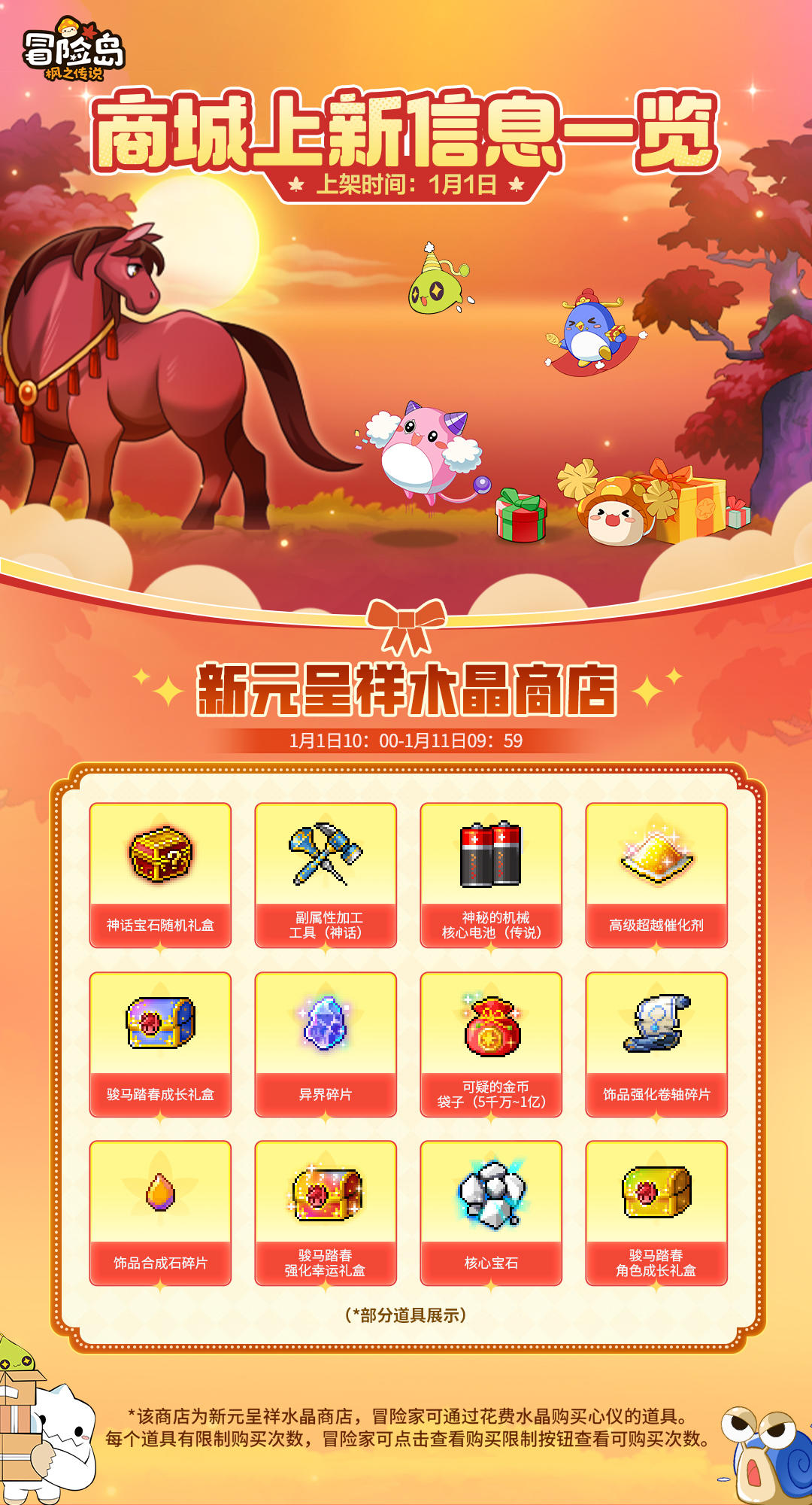 本次新元呈祥水晶商店更新特别上架了超多高价值道具特惠出售助力冒险家们角色提升,还有骏马踏春系列礼盒,红马踏春来,冒险添福运!
