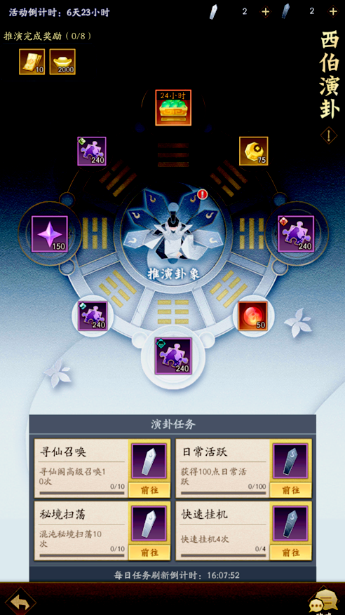 活动期间,道友可通过每日活跃任务获取阴阳二气,将阴阳二气按照不同顺序放置,将激活对应的八卦卦象,每个卦象激活时可获取天相材料、卓越伙伴碎片、资源箱等珍贵道具在内的首次推演奖励。激活全部八个卦象可额外获得高级召唤券*10+2000元宝的推演完成奖励。