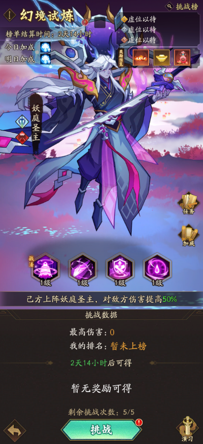 每日可挑战5次boss【妖庭圣主】,己方上阵妖庭圣主将对敌方伤害提高50%并且每日还将有不同的种族加成。最终将按照造成的最高伤害进行排名,排名靠前的道友将获得元宝、境界丹药、限时称号等丰厚奖励。