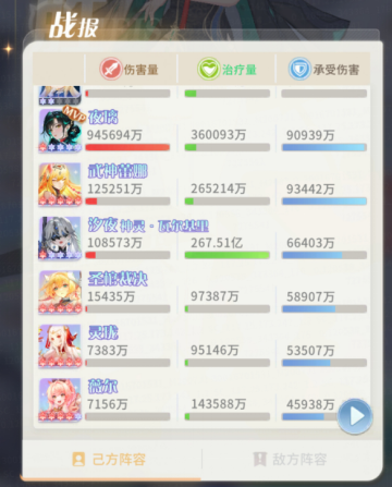 - 光环效果增强,队友闪避时可以回复能量,同时给夜璃永久叠加增伤。在夜璃的光环下,闪避几率还是挺高的,队伍内的每个人都能通过这个回能效果在一回合内额外多放出一两个大招。夜璃在增伤叠起来之后,自身伤害完全达到了超一线主C的水平,高伤害+高传导的组合拳下来,敌方后排基本上活不了了。