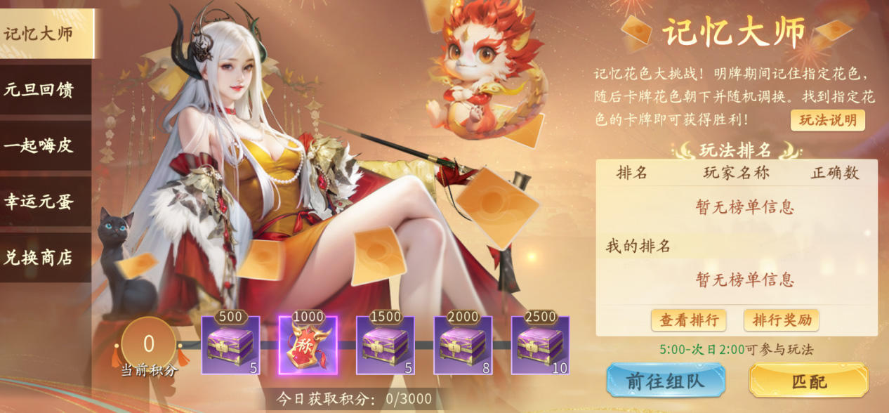想要挑到好的金蛋,可得有过目不忘的本事哦!先来一把“记忆大师”练练手吧~仙友们需要从不同花色的卡牌中记忆指定花色卡牌位置,在卡牌位置变换后,双方分别找到1张指定花色卡牌即可进入下一关,所有卡牌被成功翻出可进入下一轮,难度将随关卡轮次推进而提高哦!失败将扣除复活次数,扣完即结束游戏。