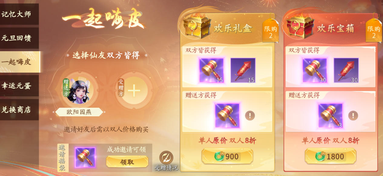小锤破旧,迎接新岁!快来准备好小锤道具吧~可原价购买一人份小锤礼盒,也可邀请仙友享受双人8折优惠价,为自己和仙友各购买一份礼包!每种礼包都限购两次也仅可受赠两次,赠送方将额外获得邀请礼和赠送礼~邀请需对方同意,成功邀请后只能进行双人购买。
