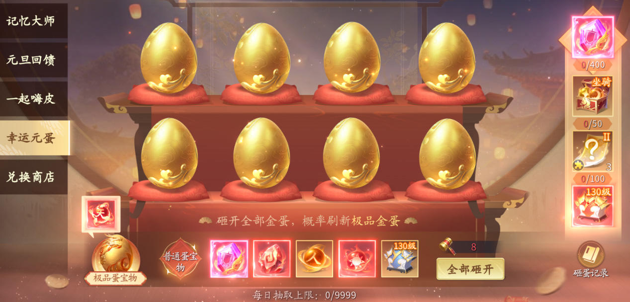 小锤砸金蛋,好礼破壳出!使用小锤砸开金蛋可获得奖励,所有金蛋砸开后将刷新新的金蛋,还有概率刷出极品金蛋,累计消耗锤子达指定数量还可以领取额外好礼!