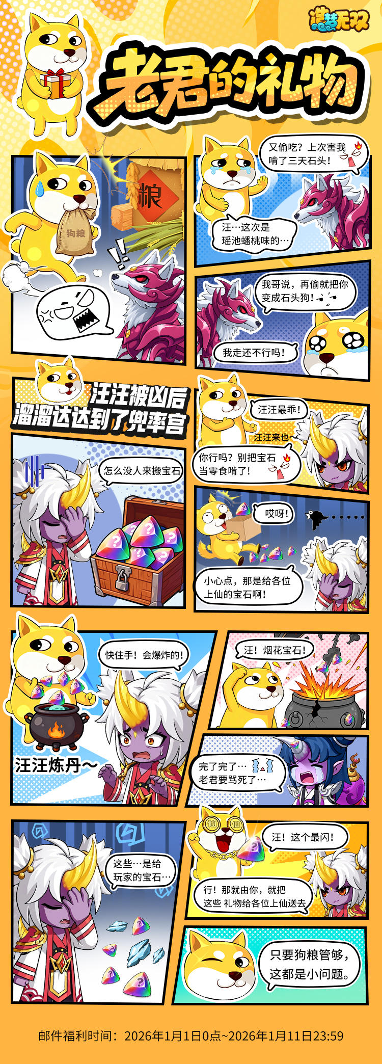 汪汪又要偷吃哮天的狗粮,结果被当场抓包。被狠狠训斥了一顿的汪汪只能到别处去想办法混些吃的,他溜溜达达到了兜率宫,正好碰上金银角童子在搬运老君送给各位上仙的礼物,看看接下来会发生什么吧~