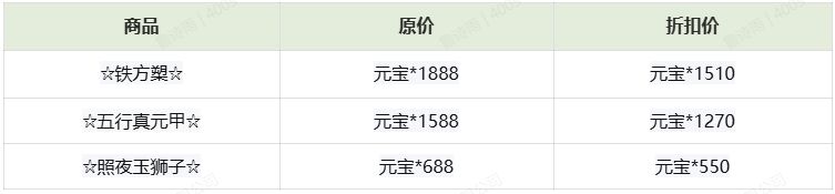 【活动内容】:活动时间内元宝商店部分装备限时折扣