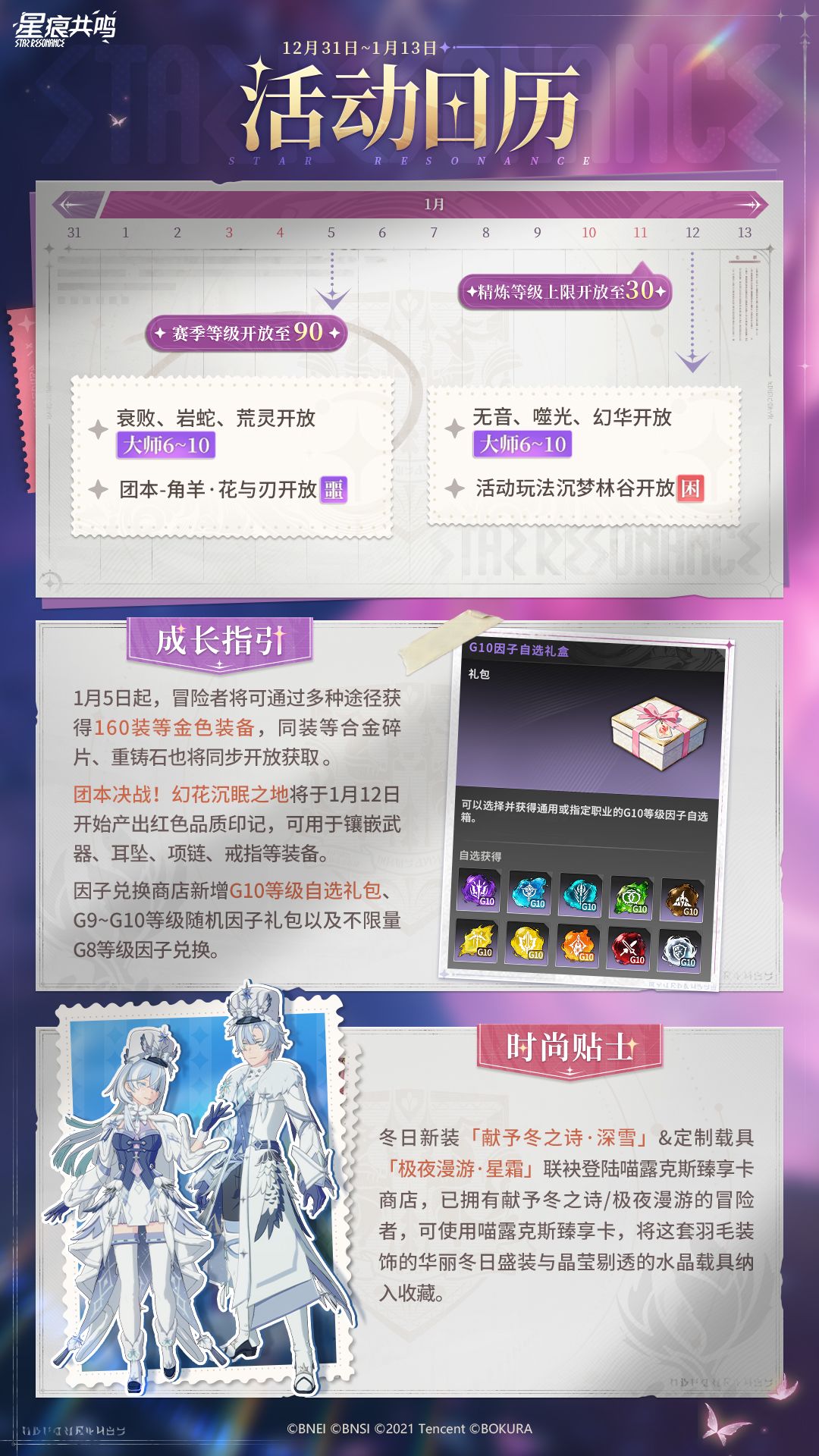 高级定制「献予冬之诗·深雪」&「极夜漫游·星霜」现已登陆喵露克斯臻享卡商店,快来获取你的冬日新装吧;极限空间6大副本即将开启大师难度6~10,冒险者将可通过多种途径获取160装等金色装备及同装等合金碎片、重铸石。