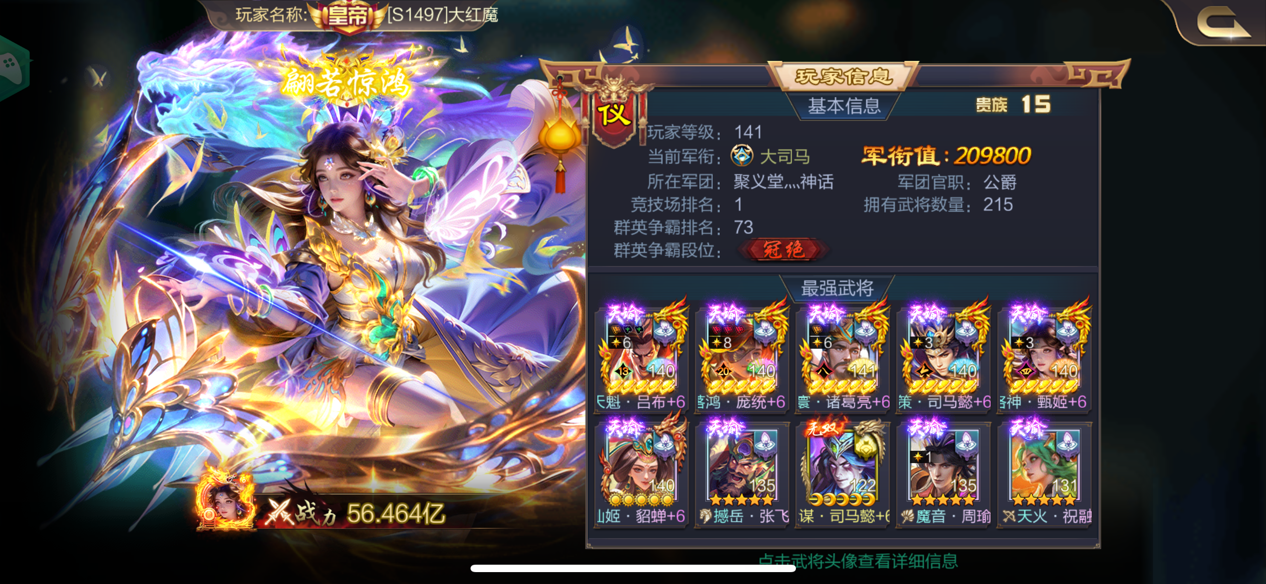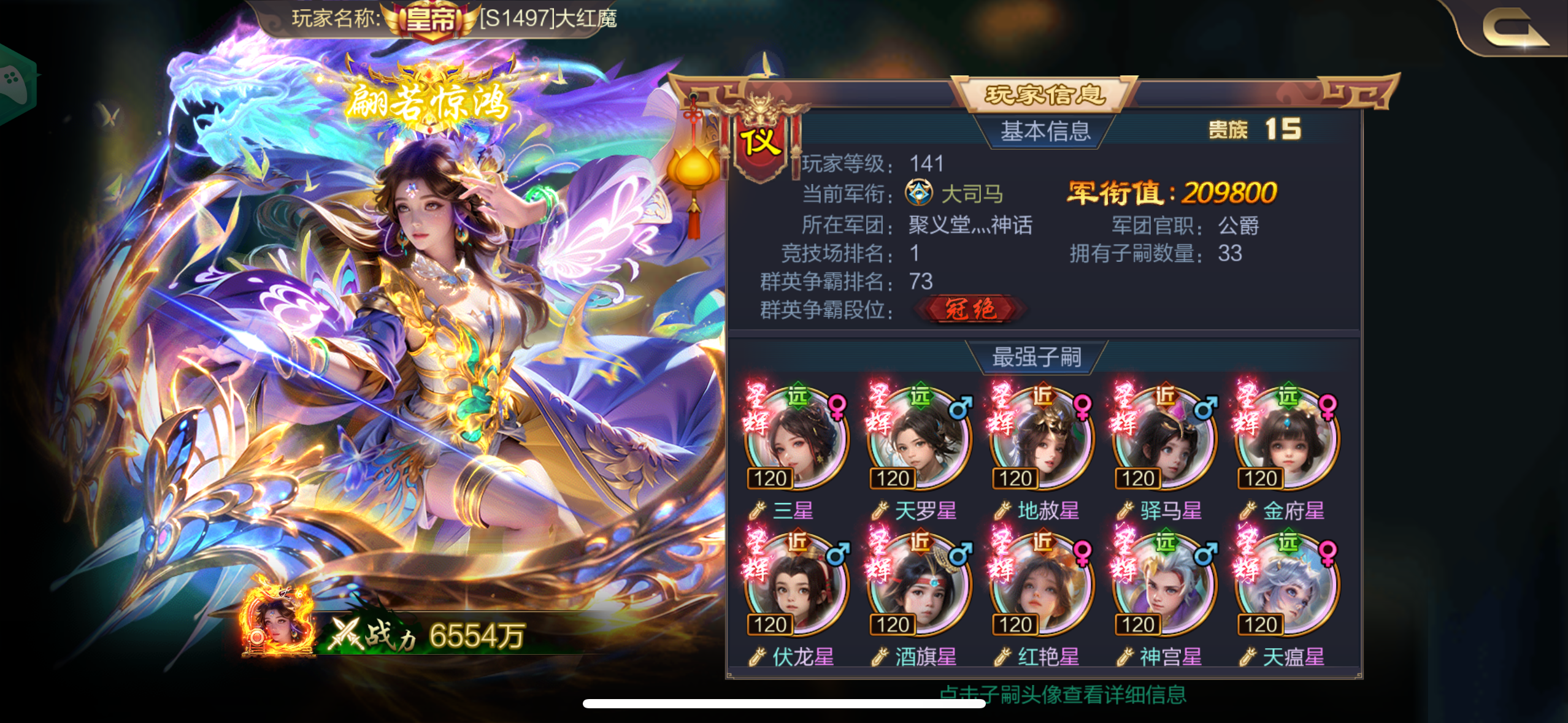 大红魔:日常接触比较多的宇文、大漠、橄榄,当然,团里的都是好兄弟。。。周边团大佬镖哥,指导武将搭配,小星星、字母、北斗、胖芬、剑无双等等也都是不打不相识的朋友,特别感谢司马烨伟在子嗣方面一直以来不遗余力的帮助,还有很多没提到名字的朋友就不一一介绍了。