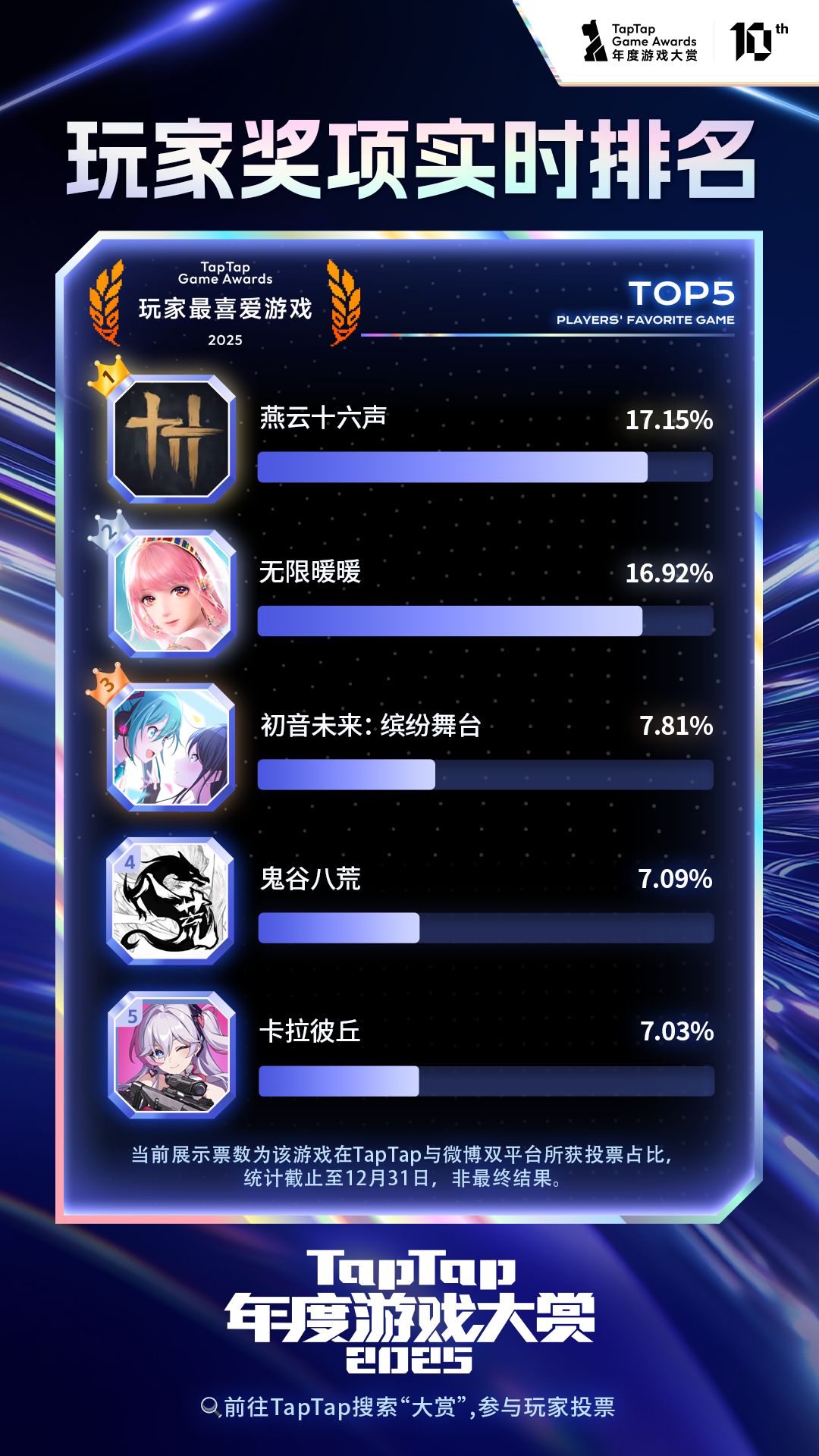 📊截至 12.30 的玩家奖项投票数前五已公布!