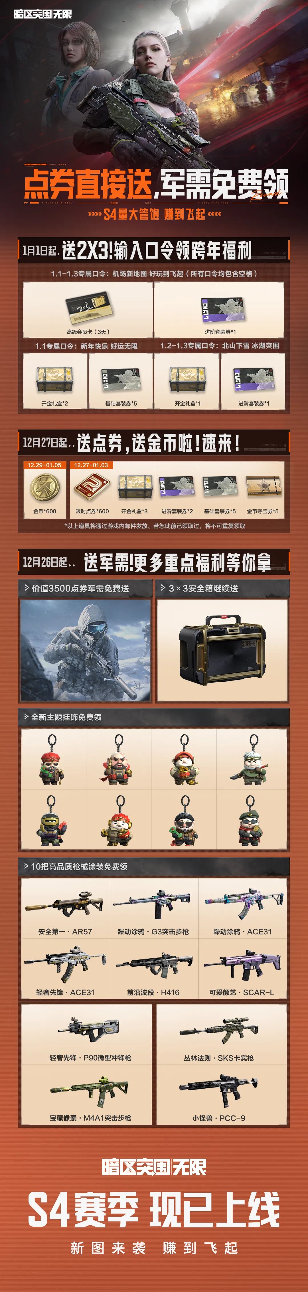 以上就是本次S4赛季为大家准备的赛季福利汇总!从全套「零度潮流」军需,到百万柯恩币补贴,再到3×3安全箱免费获取与海量枪械涂装、挂饰——每一份礼物,都是助你新赛季开局即领先的坚实保障。